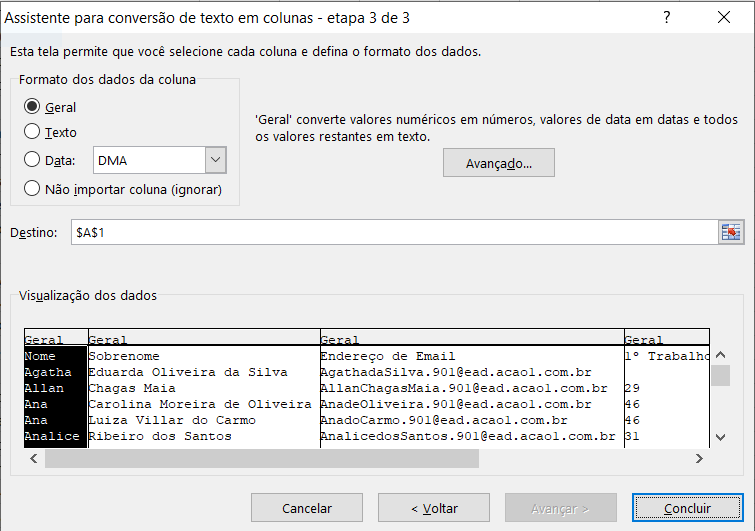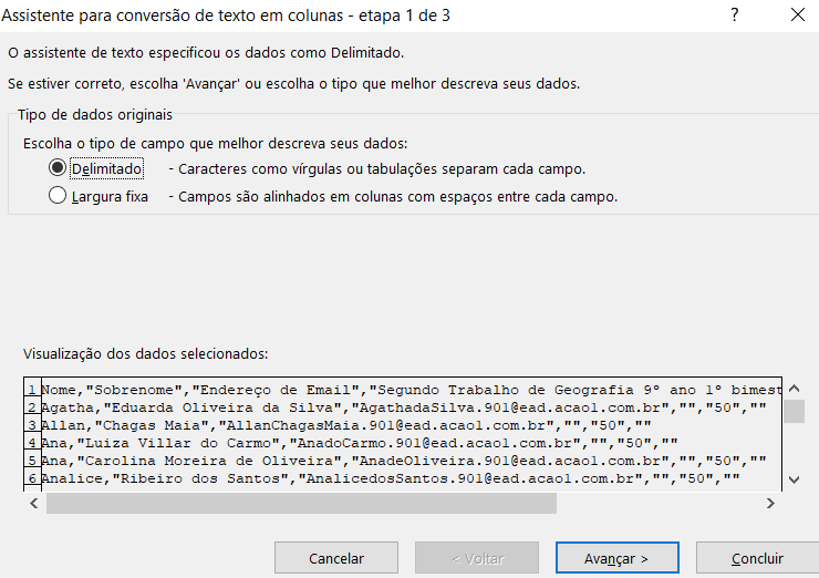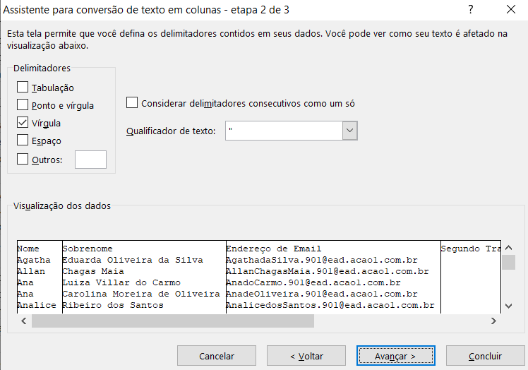 Na tela seguinte, marque apenas a opção vírgula e clique em avançar.
