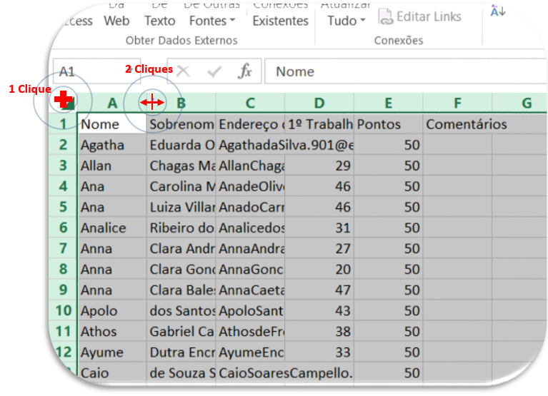 Para ajustar a largura das colunas e obter melhor visualização, clique no topo superior direito da planilha para seleciona-la inteira. Em seguida, posicione o cursor do mouse sobre a linha que divide a primeira da segunda coluna e dê um clique duplo. Veja a imagem abaixo: